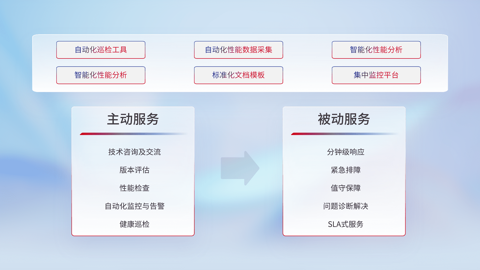 智能化工具和标准化文档,,,保障服务质量,,,,提供主动服务(包含技术咨询、、版本评估、、、性能检查、、、、自动化监控与告警、、健康巡检)和被动服务包含(分钟级响应、、、紧急排障、、、值守保障、、问题诊断解决、、SLA服务)。。。